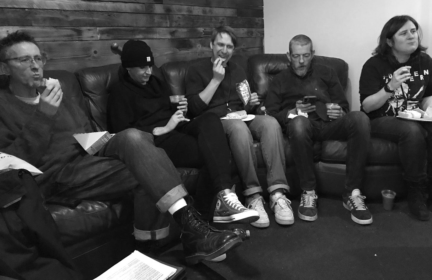 Manager Marc and Jim got drummer Ben a caterpillar cake for his birthday. Whatever the Sainsbury’s knockoff of Colin is called. We hid it in the van, on the back shelf. Then all day, people kept mentioning caterpillar cakes. Someone was playing stand-up comedy off their phone and it was a bit about caterpillar cakes. In the dressing room, our rider randomly showed up with M&S Colin The Caterpillar napkins. When we revealed the cake with Ben’s age in candles on it, Ben assumed we’d been inspired by all the mentions. The audience sang a full-throated ‘happy birthday’ and as a special birthday gift, Jim took the piss out of Ben for quite a long while onstage.